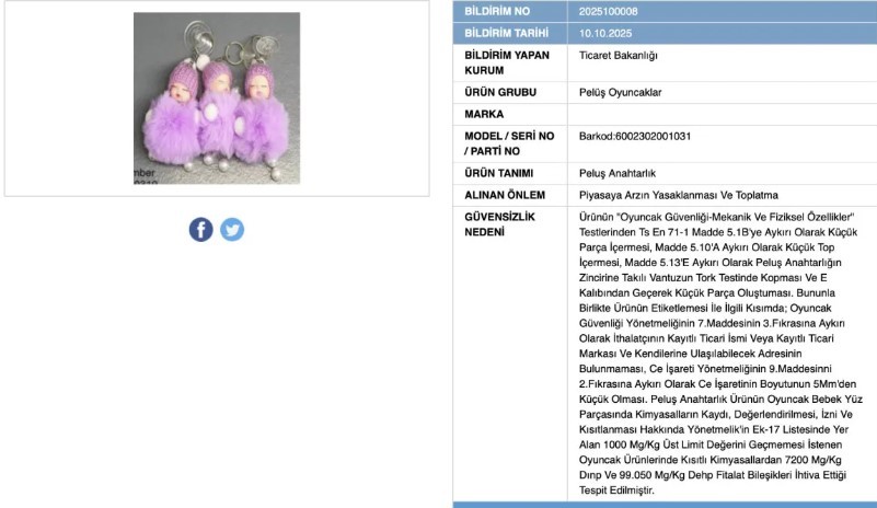 Güvensiz Ürün Bilgi Sistemi (GÜBİS) üzerinden yapılan açıklamada, bir peluş oyuncağın kullanıcı sağlığı açısından risk taşıdığı ve ürün güvenliği açısından tehdit oluşturduğu tespit edildi.