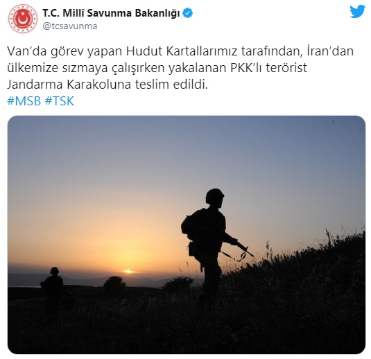 MSB'nin Twitter hesabından yapılan açıklamada, "Van'da görev yapan Hudut Kartallarımız tarafından, İran'dan ülkemize sızmaya çalışırken yakalanan PKK'lı terörist Jandarma Karakoluna teslim edildi" ifadelerine yer verildi.