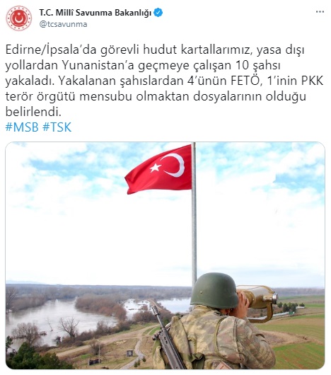 Milli Savunma Bakanlığı'ndan (MSB)yapılan açıklamada, "Edirne/İpsala'da görevli hudut kartallarımız, yasa dışı yollardan Yunanistan'a geçmeye çalışan 10 şahsı yakaladı. Yakalanan şahıslardan 4'ünün FETÖ, 1'inin PKK terör örgütü mensubu olmaktan dosyalarının olduğu belirlendi." ifadelerine yer verildi.