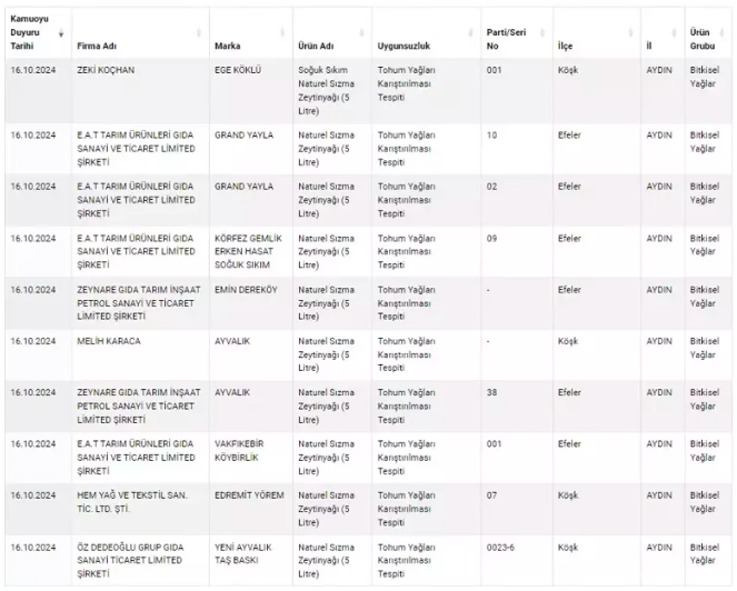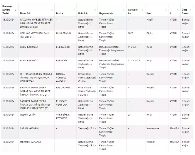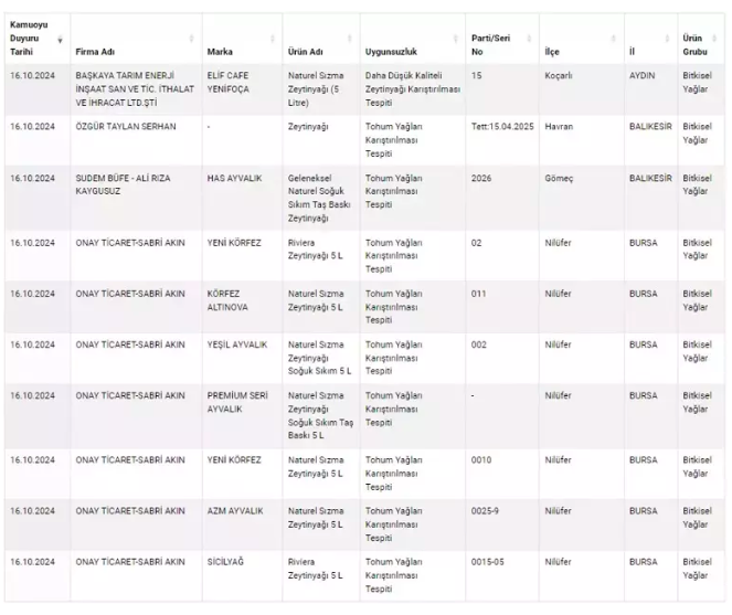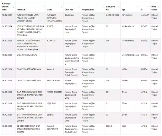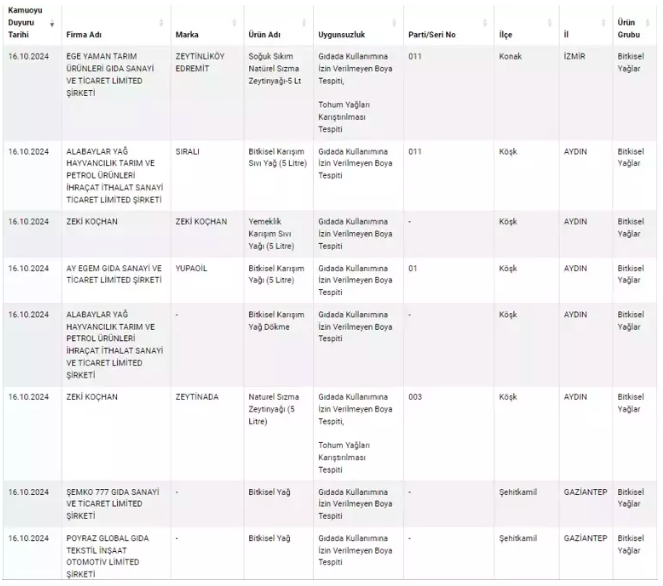 Bugünkü testlerde ise zeytinyağları radara girdi. Araştırmalar sonucunda kullanımına izin verilmeyen boyalar ve tohum yağlarının zeytinyağlarına karıştırıldığı ortaya çıktı.