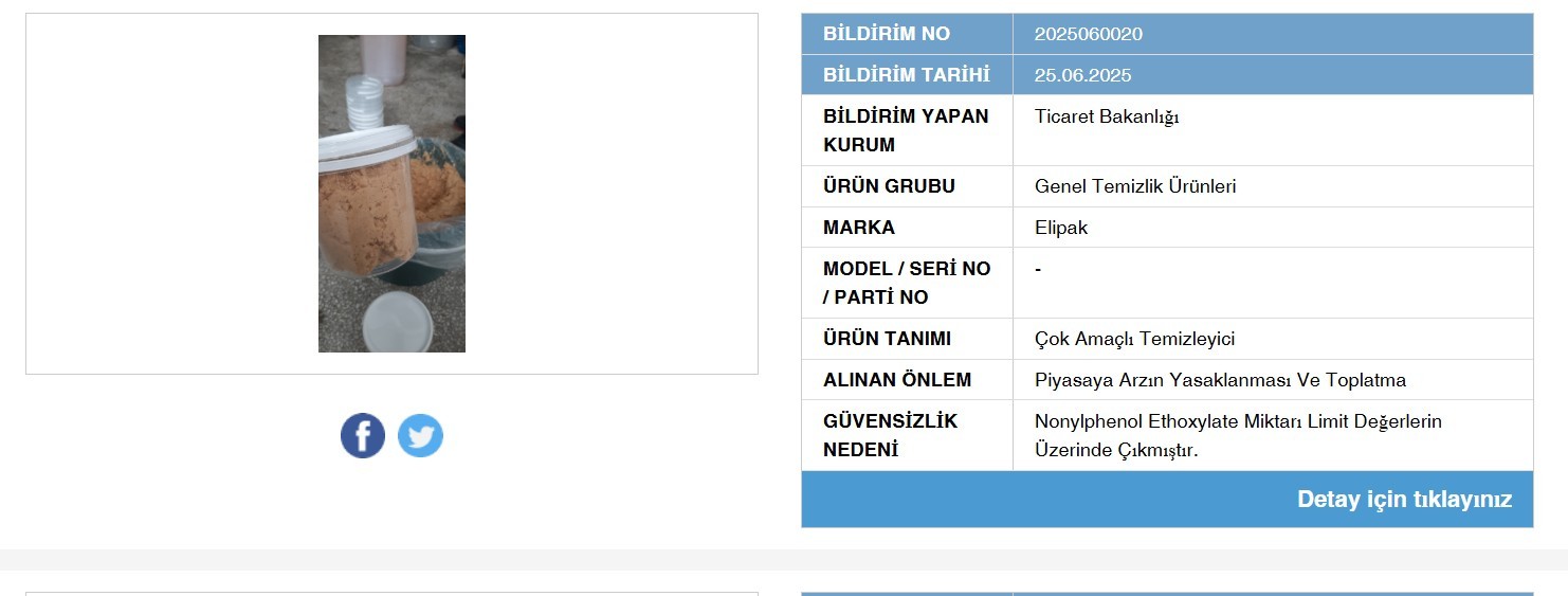 Açıklama, Güvensiz Ürün Bilgi Sistemi (GÜBİS) üzerinden kamuoyuna duyuruldu. Yapılan test ve analizler sonucunda söz konusu temizlik maddesinin insan sağlığına zarar verebileceği ortaya çıktı.