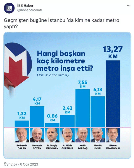 İBB Haber'in hazırladığı görselde Ekrem İmamoğlu'nun İstanbul'a 13,27 kilometre metro hattı kazandırdığı, Recep Tayyip Erdoğan'ın 0,86 kilometre metro hattı inşa ettiği, İstanbul'un en çalışkan isimlerinden biri olan rahmetli eski İBB Başkanı Kadir Topbaş'ın ise 7,55 kilometre metro yaptığı iddia edildi.