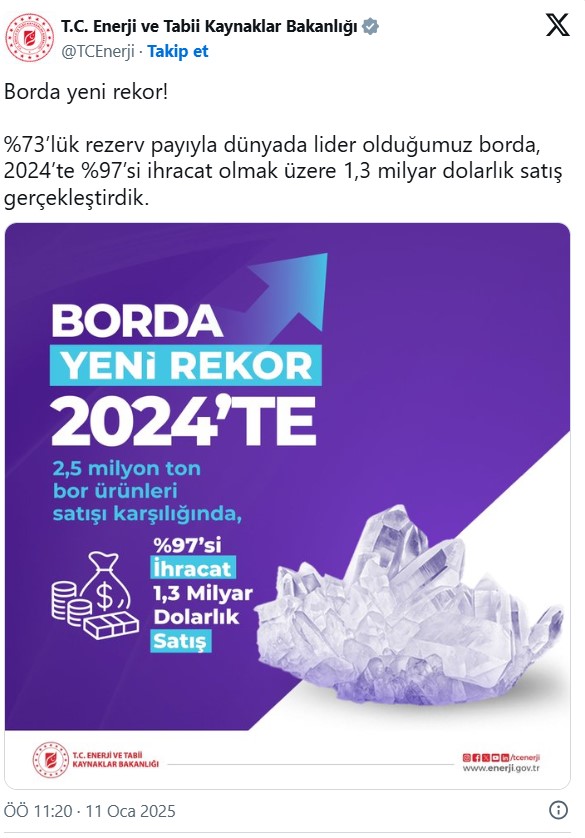 Enerji ve Tabii Kaynaklar Bakanlığı'nın sosyal medya hesabından yapılan paylaşım ile Türkiye'nin borda yeni bir rekora imza attığı bildirildi. Buna göre Türkiye, yüzde 73'lük rezerv payıyla dünyada lider olduğu borda, 2024 yılında yüzde 97'si ihracat olmak üzere 1,3 milyar dolarlık satış gerçekleştirdi.