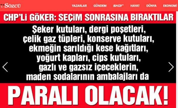 Memleket muhaliflerinin ‘Sözcü’sü, söz konusu haber yalanlandığı halde algı oluşturmaya devam ediyor. Bugün verilen haberde, seçimlerden sonra yoğurt kabı, ekmeğin sarılı olduğu kağıt poşet ya da gazlı içecek kaplarından da ücret alınmaya başlanacağı iddia edildi.