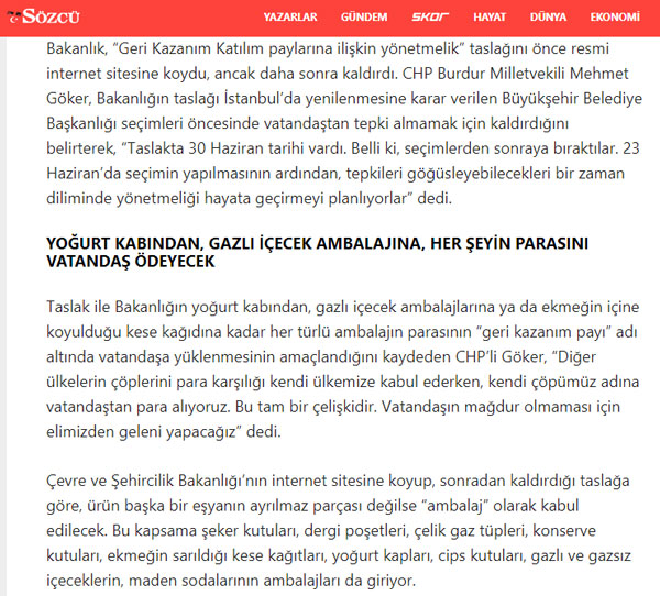 Çevre ve Şehircilik Bakanlığı’nın, naylon poşetlerin ardından, yoğurt kabı, ekmeğin sarılı olduğu kağıt poşet ya da gazlı içecek kaplarından da ücret alacağına dair haberler, ilgili bakanlık tarafından yalanlandı. Buna rağmen Sözcü, halen CHP’lilerin sözcülüğünü yaparak aynı yalanı sürdürüyor.
