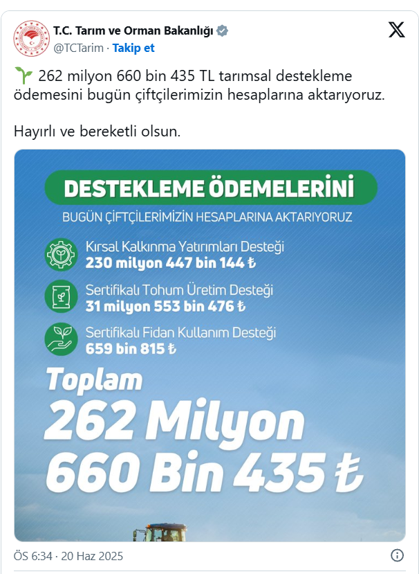 Tarım ve Orman Bakanlığı, sosyal medya hesabı üzerinden yaptığı açıklama ile 262 milyon 660 bin 435 liralık tarımsal destekleme ödemesinin bugün çiftçilerin hesaplarına aktarılacağını duyurdu. Bakanlık, "Hayırlı ve bereketli olsun" diyerek, yapılan ödemelerin detaylarını paylaştı. Ödemeler, kırsal kalkınma yatırımları, sertifikalı tohum üretim desteği ve sertifikalı fidan kullanım desteği için yapılacak.