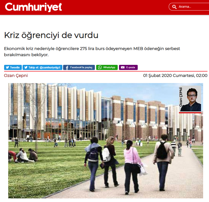 Yalan bülteni Kemalist Cumhuriyet'in bir haberi daha elinde patladı. Bugün “Kriz öğrenciyi de vurdu” başlıklı bir haber yayınlayan Cumhuriyet'in mumu yatsıya kadar bile yanmadı. Öğrencileirin 2020 yılı Ocak ayı burslarının kriz nedeniyle yatırılmadıpını iddia eden Cumhuriyet'e cevap Milli Eğitim Bakanlığı'ndan geldi. Bakanlık, yaptığı yazılı açıklamada, söz konusu haberin gerçeği yansıtmadığını duyurarak bugün itibariyle ödemelerin yapıldığını açıkladı.