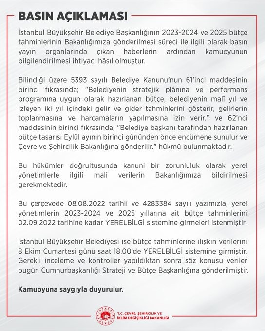 "8 Ağustos 2022 tarihli, 4283384 sayılı yazımızla yerel yönetimlerin, 2023-2024 ve 2025 yıllarına ait bütçe tahminlerini 2 Eylül 2022 tarihine kadar 'YerelBilgi' sistemine girmeleri istenmiştir. İBB ise bütçe tahminlerine ilişkin verilerini, 8 Ekim Cumartesi günü saat 18.00'de YerelBilgi sistemine girmiştir. Gerekli inceleme ve kontroller yapıldıktan sonra söz konusu veriler bugün Cumhurbaşkanlığı Strateji ve Bütçe Başkanlığına gönderilmiştir."