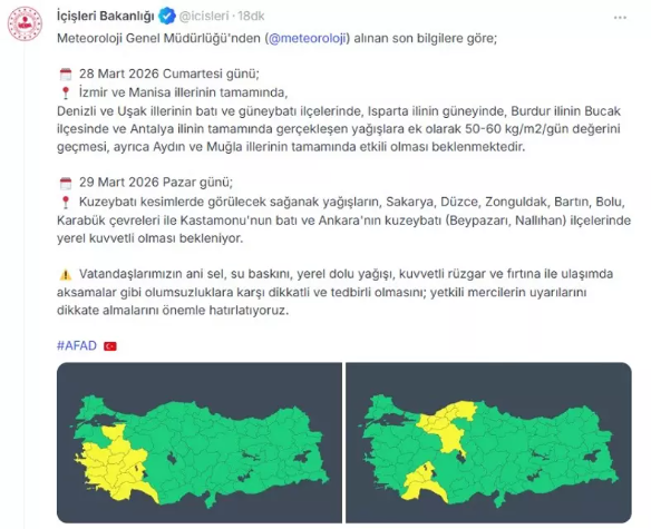 Paylaşımda, yarın kuzeybatı kesimlerde etkisini gösterecek yağışın Sakarya, Düzce, Zonguldak, Bartın, Bolu, Karabük çevreleri ile Kastamonu'nun batı ve Ankara'nın kuzeybatı ilçelerinde yerel kuvvetli olacağı belirtildi.