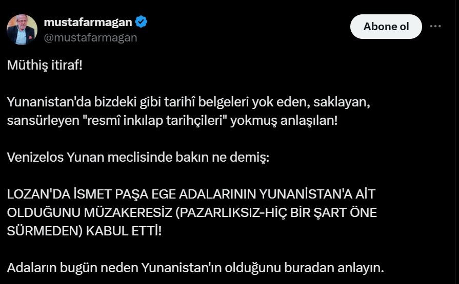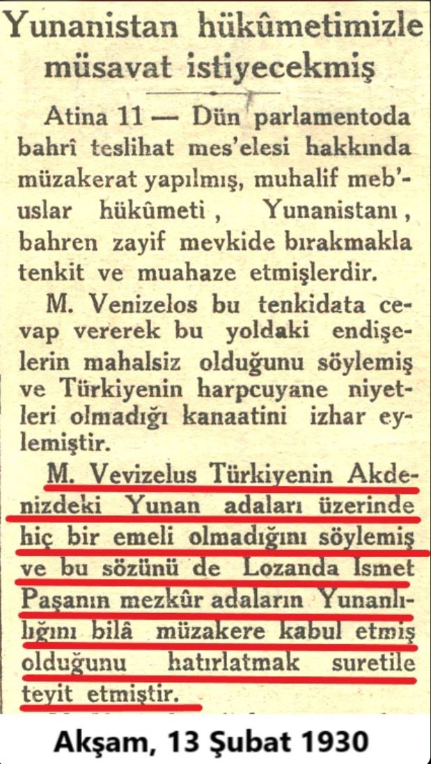 Konuya ilişkin Akşam Gazetesi’nin 13 Şubat 1930 tarihli kupürünü içeriğiyle birlikte paylaşan Mustafa Armağan, şu ifadelere yer verdi: “Müthiş itiraf! Yunanistan'da bizdeki gibi tarihî belgeleri yok eden, saklayan, sansürleyen ‘resmî inkılap tarihçileri’ yokmuş anlaşılan! Venizelos Yunan meclisinde bakın ne demiş: Lozan'da İsmet Paşa Ege Adalarının Yunanistan'a ait olduğunu müzakeresiz (pazarlıksız-hiç bir şart öne sürmeden) kabul etti! Adaların bugün neden Yunanistan'ın olduğunu buradan anlayın”