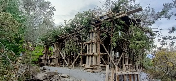Muğla'nın Bodrum ilçesinde ağaç dallarıyla kapatılıp gizlenmeye çalışılan kaçak inşaat tespit edildi.
