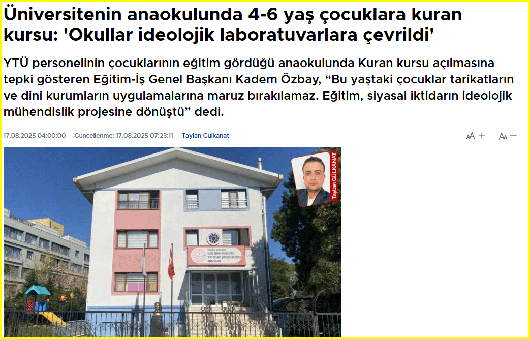 Kemalizmin ezberlettiği 100 yıllık sloganik cümlelerin papağan gibi tekrar edildiği haberde, “Laik, bilimsel ve demokratik eğitim; çocuklarımızın hakkı, toplumun teminatıdır” denildi. Aynı zamanda, “YTÜ ve tüm okullar, siyasi ve dini projelerin uygulama alanı olmaktan çıkarılmalıdır. Üniversiteler bilim üretir, okullar çocuklara çağdaş eğitim verir, camiler ibadet yeridir. Bu sınırlar silinirse, laiklik yok olur, bilim geriler, çocuklarımızın geleceği karanlığa teslim edilir. Okul okuldur, üniversite üniversitedir, cami camidir! Bu kuşatmaya karşı sesimizi yükseltmek tarihsel bir sorumluluktur” ifadelerine yer verildi. Bölgede yaşayan insanların evlatlar için Kur’an kursu istediği ve çevrede bir cami olmadığı gerçeği ise örtbas edildi!..
