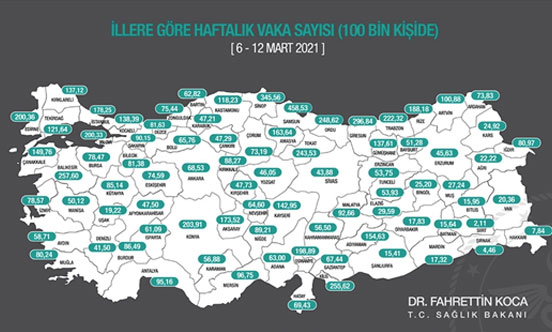 Balıkesir’de her 100 bin kişide haftalık (6-12 Mart) Kovid-19 vaka sayısı 257,60 olarak açıklandı.