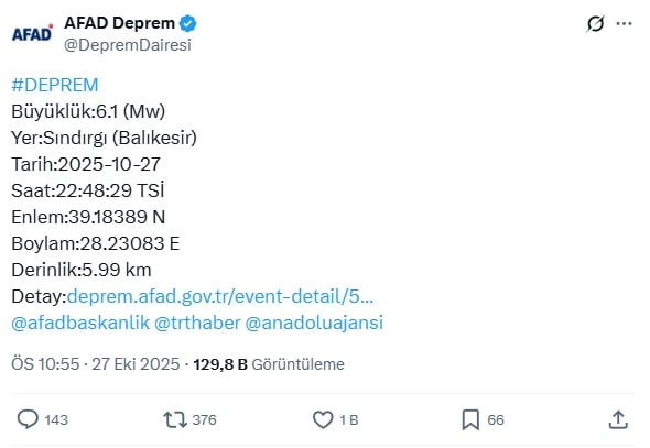 Afet ve Acil Durum Yönetimi Başkanlığının (AFAD) internet sitesinde yer alan bilgiye göre, merkez üssü Sındırgı ilçesi olan 6,1 büyüklüğünde sarsıntı kaydedildi.