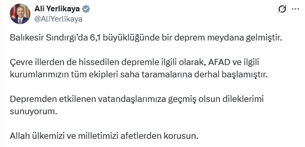 BAKAN YERLİKAYA: TÜM EKİPLERİMİZ SAHA TARAMALARINA DERHAL BAŞLAMIŞTIR