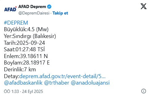 Balıkesir'in Sındırgı ilçesinde saat 01.27'de 4,5 büyüklüğünde bir deprem meydana geldi.
