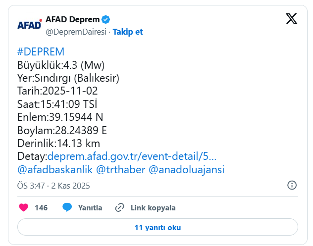 AFAD'ın açıkladığı verilere göre saat 15.41'te Balıkesir Sındırgı'da 4.3 büyüklüğünde bir deprem meydana geldi