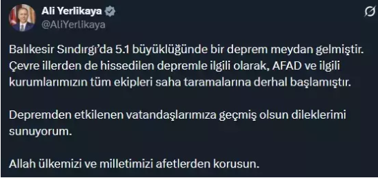 Balıkesir'de meydana gelen deprem İstanbul ve çevresinde hissedildi. Depremin ardından açıklama yapan İçişleri Bakanı Ali Yerlikaya, "Balıkesir Sındırgı'da 5.1 büyüklüğünde bir deprem meydan gelmiştir" diye yazan Yerlikaya, "Çevre illerden de hissedilen depremle ilgili olarak, AFAD ve ilgili kurumlarımızın tüm ekipleri saha taramalarına derhal başlamıştır. Depremden etkilenen vatandaşlarımıza geçmiş olsun dileklerimi sunuyorum. Allah ülkemizi ve milletimizi afetlerden korusun" ifadelerini kullandı.