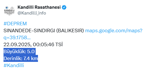 Balıkesirde deprem meydana geldi. Kandilli rasathanesine göre büyüklük 5.0 derinlik 7.4
