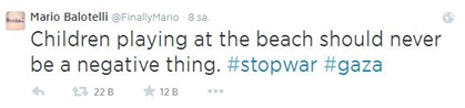 Balotelli, resmi Twitter hesabı üzerinden Gazze'deki insanlık dışı katliama 'dur' çağrısında bulundu. Yıldız futbolcu Tweet'inde, 'Children playing at the beach should never be a negative thing. #stopwar #gazze' ifadelerini kullanarak, plajlardaki çocukların hiçbir düşünce suçunun olmadığı ve Gazze'deki savaşın durması gerektiğini savundu.