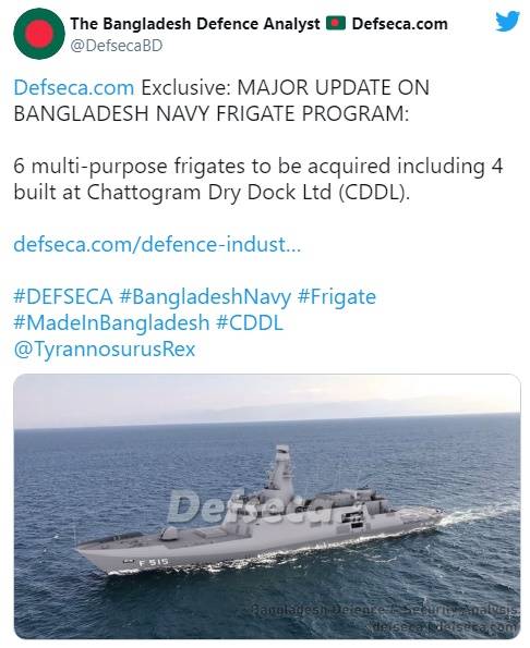 Bangladeş Donanması’nın fırkateyn ihtiyacını karşılamak için 6 adet (2 adedi tedarikçi ülke, 4 adedi Chattogram Drydock Ltd. (CDDL) tarafından inşa edilmek üzere) çok maksatlı fırkateynin tedarikini kapsayan ihale finalistlerin belirlenmesiyle beraber sonuca bir adım daha yaklaştı. Finale Türkiye, Çin, Hollanda ve İtalya’nın kaldığı ihaleye aynı zamanda İngiltere, Fransa, Hindistan ve Güney Kore ilgi göstermişti.