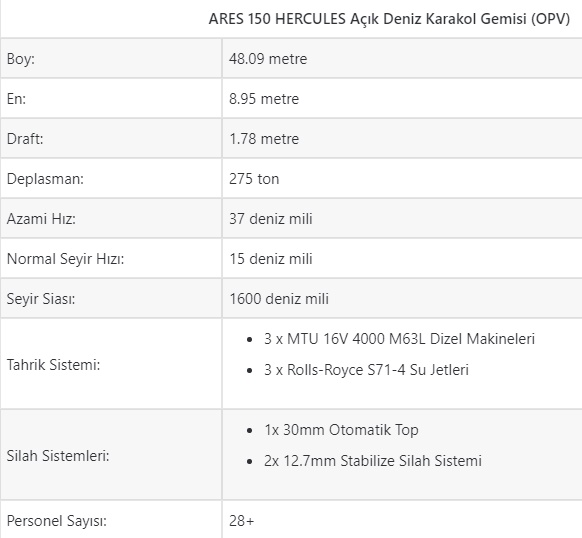 ARES 150 HERCULES; 48 metre boya, 37 deniz mili azami sürate ve 1600 deniz mili seyir siasına sahip. Geminin üzerinde, konvansiyonel ve asimetrik tehditlere karşı kullanılmak için elektro-optik sensörler ile 30mm’lik MUHAFIZ Uzaktan Komutalı Stabilize Top ve 2 adet 12.7mm STAMP Uzaktan Komutalı Stabilize Silah Sistemleri bulunuyor.