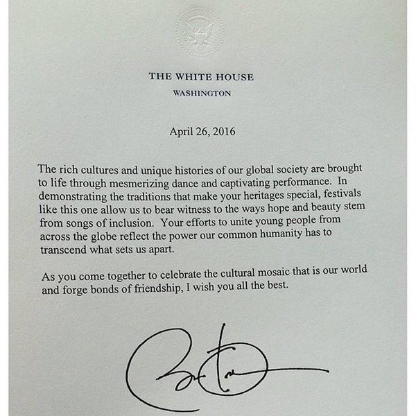 Obama mektubunda, “Kendi kültürel mirasınızı özel kılan geleneklerinizi aktarması bakımında bu gibi festivaller, bize kucaklayıcılığın şarkılarından çıkıp ümit ve güzelliğe doğru giden yollara şahitlik etmemize olanak sağlıyor” ifadesini kullandı.