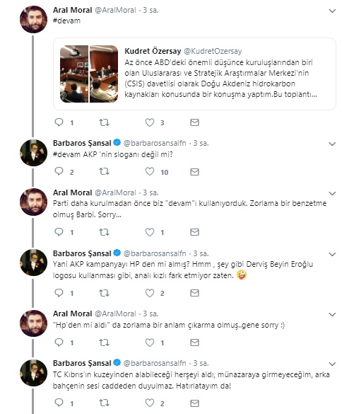 KKTC Başbakan Yardımcısı ve Dışişleri Bakanı Prof. Dr. Kudret Özersay'ın attığı bir tweette, "ABD’deki önemli düşünce kuruluşlarından biri olan Uluslararası ve Stratejik Araştırmalar Merkezi’nin (CSIS) davetlisi olarak Doğu Akdeniz hidrokarbon kaynakları konusunda bir konuşma yaptım" ifadelerine yorum yapan Aral Moral adlı Twitter kullancısına sataşan hain Şansal, üst üste yediği ayarlarla suspus oldu.