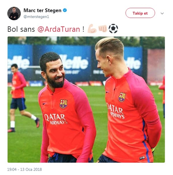 Barcelona'daki birçok yıldız isimle arkadaşlığıyla bilinen, sosyal medya hesabı üzerinden yaptığı paylaşımlarla takım ortamından duyduğu memnuniyetini dile getiren Arda Turan'a sadece iki arkadaşı veda etti. Veda eden futbolculardan biri Barcelona'nın file bekçisi ter Stegen, diğeri ise orta saha oyuncusu Rafinha'ydı.
