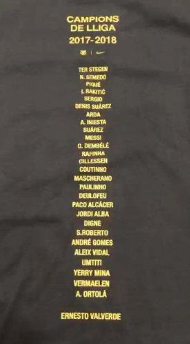 Barcelona'nın şampiyonluk tişörtünde Deulofeu'nun yanı sıra Javier Mascherano ve Arda Turan'ın da isminin olmaması dikkat çekti. Sezonun ikinci yarısında takıma dahil olan ancak çok az maça çıkan Yerry Mina ve sezonun ilk yarısında sakatlığı nedeniyle hiç oynamayan ve ardından Inter'e kiralanan Rafinha'nın isimlerinin yer alıp bu isimlerin tişörtte yazılmaması dikkatlerden kaçmadı.