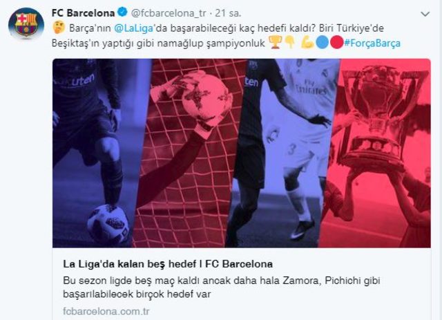 Katalan ekibinin Twitter'daki Barcelona Türkiye hesabından yapılan paylaşımda, "Barça'nın La Liga'da başarabileceği kaç hedefi kaldı? Biri Türkiye'de Beşiktaş'ın yaptığı gibi namağlup şampiyonluk" mesajı yazıldı.
