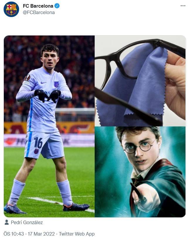 2. golü atan Pedri ve Harry Potter fotoğrafları paylaşan Barcelona, gözlük fotoğrafıyla Kerem'e gönderme yaptı. Galatasaray tarafları paylaşımın altına espriyi beğenmediklerini belirten yorumlar bıraktı.