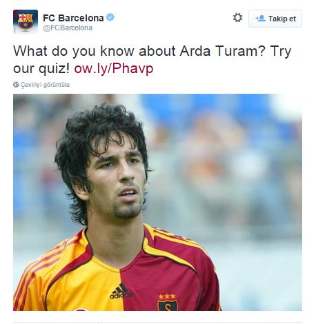 Ancak Bordo mavililer bu testi resmi Twitter sayfasından duyurmaya çalışırken tek harflik bir hata yaptı. Arda Turan'ın soyadını yanlış yazan Barça "Arda Turam hakkında ne biliyorsunuz? Buyurun quize" mesajı paylaşınca futbolseverlerden büyük tepki çekti.