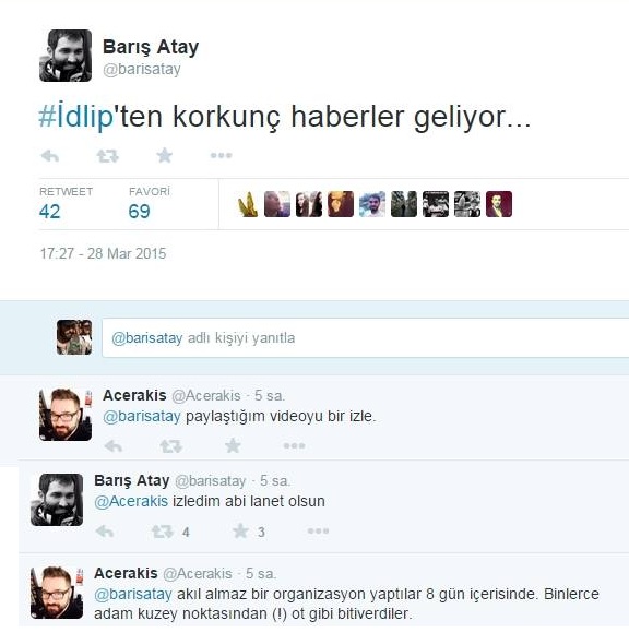 Muhalif Çatı Birliği Fetih Ordusu Suriye'nin kuzeybatısında yer alan İdlib kentinin denetimini tamamıyla sağlamış, ardından Muhalifler şehirdeki Hafız Esed'e ait dev heykeli yıkmaya başlamıştı. Haberin gündeme bomba gibi düşmesinin ardından Gezi destekçisi Barış Atay, "Idlib'ten korkunç haberler geliyor" ifadelerini kullandı.