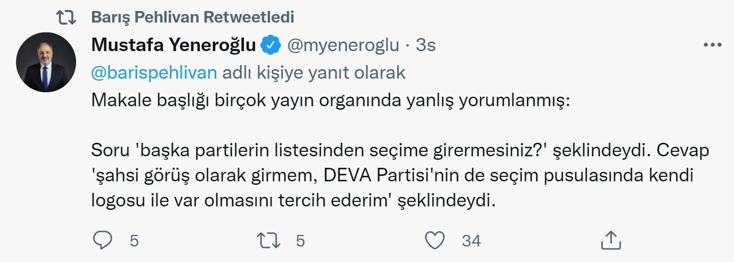 Barış Pehlivan ise Mustafa Yeneroğlu'nun şahsi sözlerini DEVA Partisi'nin resmi açıklaması olarak çarpıtmıştı.
