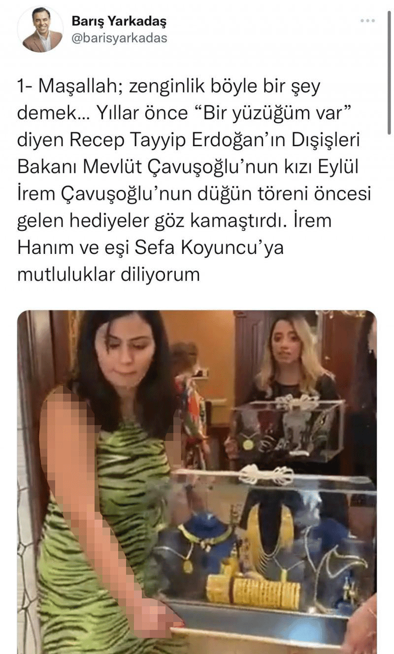 "Maşallah; zenginlik böyle bir şey demek… Yıllar önce “Bir yüzüğüm var” diyen Recep Tayyip Erdoğan’ın Dışişleri Bakanı Mevlüt Çavuşoğlu’nun kızı Eylül İrem Çavuşoğlu’nun düğün töreni öncesi gelen hediyeler göz kamaştırdı. İrem Hanım ve eşi Sefa Koyuncu’ya mutluluklar diliyorum."