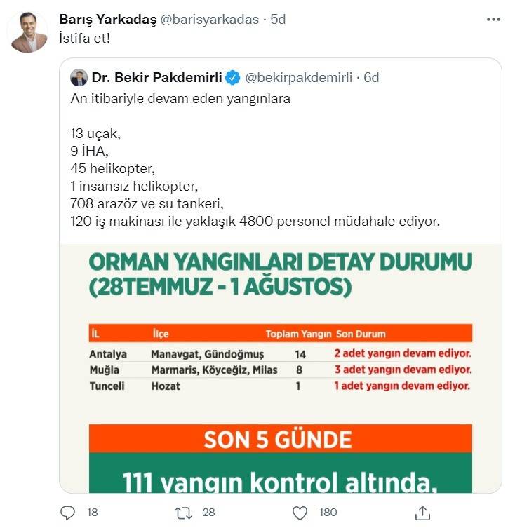 Bakan Bekir Pakdemirli’nin Twitter’dan yaptığı bu bilgilendirmeye, eski CHP’nin Milletvekili Barış Yarkadaş’tan ilginç bir tepki geldi. Yardakaş, 117 orman yangınından 111 tanesi kontrol altına alınmış olmasına rağmen Bakan Pakdemirli’ye istifa çağrısı yaptı.