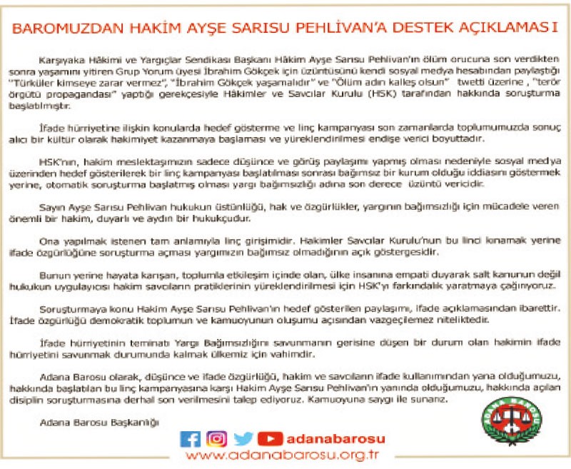 PKK’ya hizmet eden HDP’li belediyelere kayyım atanmasından rahatsız olan, istihbarat mensuplarımızın ailelerinin deşifre edilmesinden rahatsız olmayan Adana Barosu ise hakim Pehlivan’ın teröristler için yaptığı güzellemelerden “bir mesaj” olarak bahsetti. Devlete kurşun sıkanlara övgüler dizen Ayşe Sarısu Pehlivan’ın yanında yer alan baro, “Ayşe Sarısu Pehlivan’ın yanında olduğumuzu beyan ediyoruz” açıklamasını yaptı.