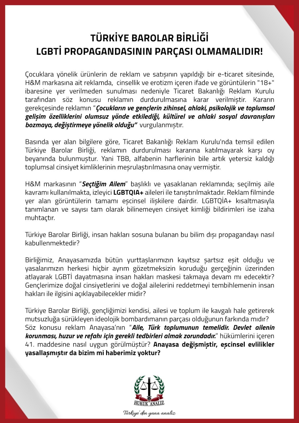Hukuk Analiz ekibi tarafından yapılan açıklamada Türkiye Barolar Birliği, il baroları ve avukatlar LGBT propagandasına karşı mücadeleye çağrıldı.