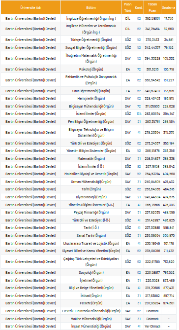 Bartın Üniversitesi 2021 taban puanları ve yüzdelik dilimleri nelerdir?