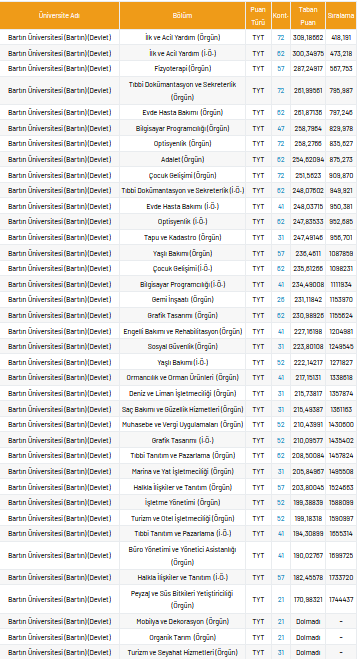 Bartın Üniversitesi 2 yıllık taban puanları 2021, yüzdelik dilimleri ve kontenjan sayıları kaçtır?