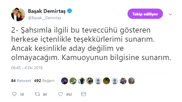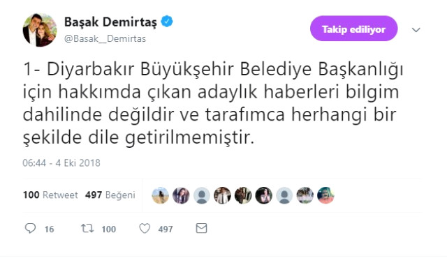 "Diyarbakır Büyükşehir Belediye Başkanlığı için hakkımda çıkan adaylık haberleri bilgim dahilinde değildir ve tarafımca herhangi bir şekilde dile getirilmemiştir. Şahsımla ilgili bu teveccühü gösteren herkese içtenlikle teşekkürlerimi sunarım. Ancak kesinlikle aday değilim ve olmayacağım. Kamuoyunun bilgisine sunarım."
