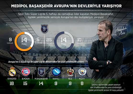 Süper Lig'de 5. haftayı da namağlup lider kapatan Medipol Başakşehir, ligdeki 14 maçlık yenilmezlik serisiyle Avrupa'nın dev kulüplerini geride bırakmayı başardı.