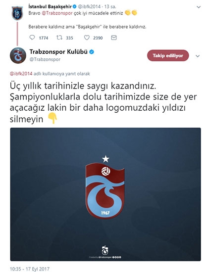 Karadeniz ekibi ise şu karşılığı verdi: "Üç yıllık tarihinizle saygı kazandınız. Şampiyonluklarla dolu tarihimizde size de yer açacağız lakin bir daha logomuzdaki yıldızı silmeyin."