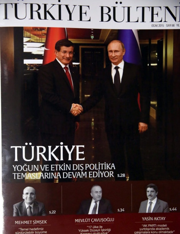 AK Parti Tanıtım ve Medya Başkanlığı tarafından hazırlanan "Türkiye Bülteni" adlı derginin Ocak 2015 sayısı yayınlandı. Yeni yılın ilk sayısının kapağı ise dış politikaya ayrıldı. 1 Aralık 2014'te Ankara'ya gelen Rusya Devlet Başkanı Vladimir Putin'in temaslarına da dergide yer verildi. Derginin kapağını ise Başbakan Davutoğlu ile Rusya Devlet Başkanı Putin'in tokalaşırken çekilen bir fotoğrafı oluşturdu. Dergide yer alan haberde, Türkiye'nin yoğun ve etkin dış politika temaslarına devam ettiği vurgulandı. Bu çerçevede, Rusya Devlet Başkanı Putin, İngiltere Başbakanı Cameron, Papa Franciscus, İtalya Başbakanı Matteo, Irak Başbakanı Abadi'nin Türkiye temasları anlatıldı. Dergide, bu liderlerin Başbakan Davutoğlu'nun yanı sıra Cumhurbaşkanı Erdoğan ile beraber çekilmiş fotoğrafları ile Başbakan Davutoğlu'nun Yunanistan ve Makedonya ziyaretleri de yer aldı.