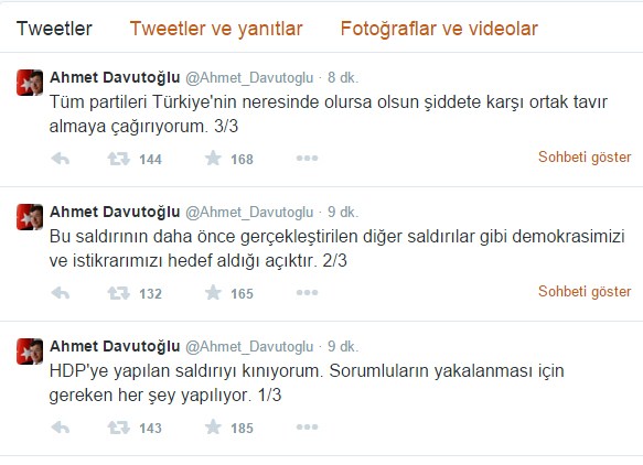 Başbakan Ahmet Davutoğlu, "HDP'ye yapılan saldırıyı kınıyorum. Sorumluların yakalanması için gereken her şey yapılıyor. Saldırıların yakalanması için çalışmalar yapılıyor. Bu saldırıların geçmiş dönemde yapılan saldıralar gibi istikarar ve demokrasiyi hedef aldığı açıktır. Tüm partileri Türkiye'nin neresinde olursa olsun şiddete karşı ortak tavır almaya çağırıyorum" dedi.