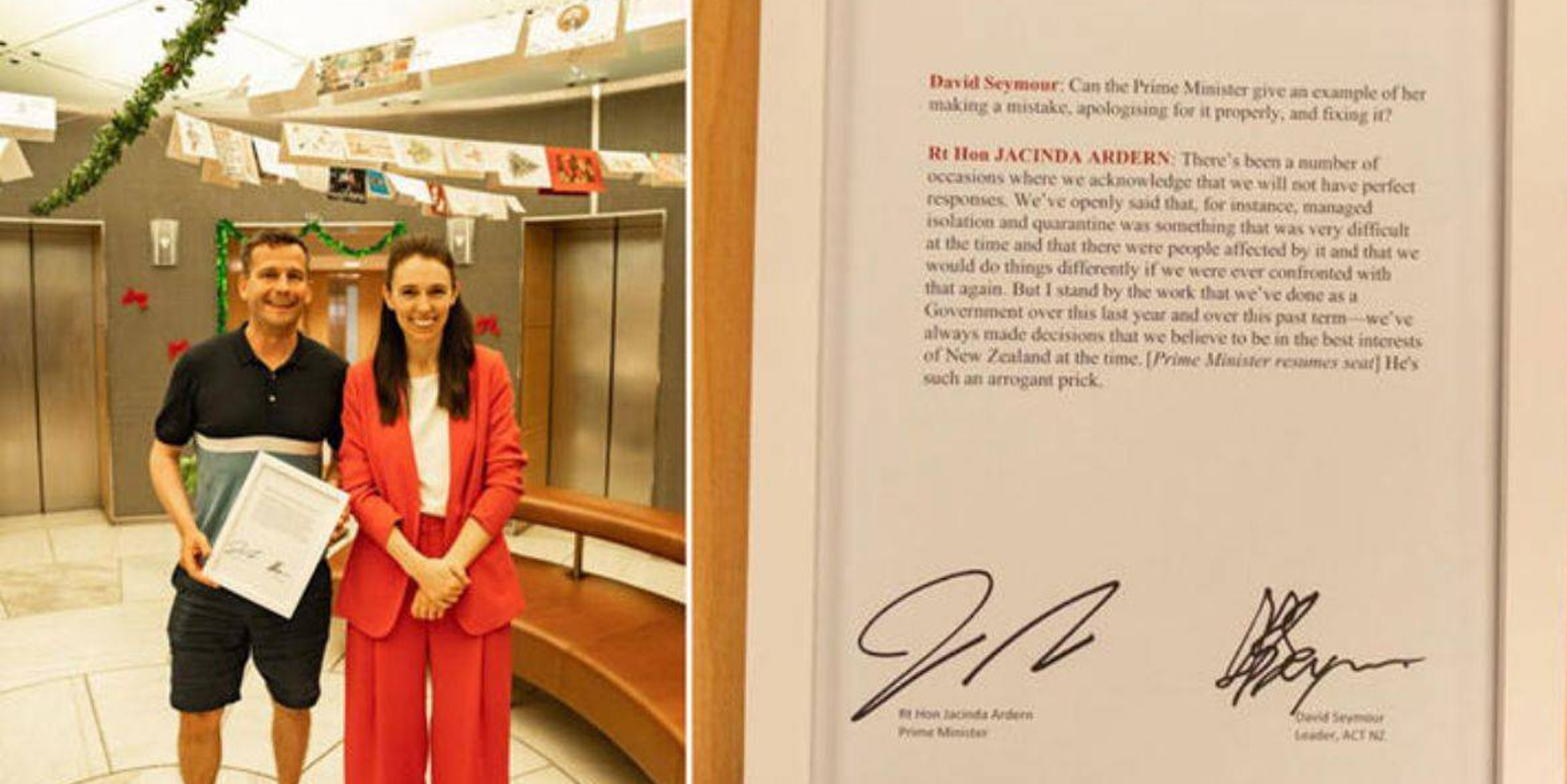 Parlamentonun resmi konuşma kayıtlarının o bölümü, 15 Aralık'ta Başbakan Ardern ile David Seymour tarafından imzalandı ve resmi belge açık attırmada satışa sunuldu. Bugün sona ermesi beklenen açık attırmada 100 bin dolar teklif verildi. 282 kişinin teklif verdiği belgenin satışından elde edilen gelir, Yeni Zelanda'ki Prostat Kanseri Vakfı'na bağışlanacağı belirtildi.