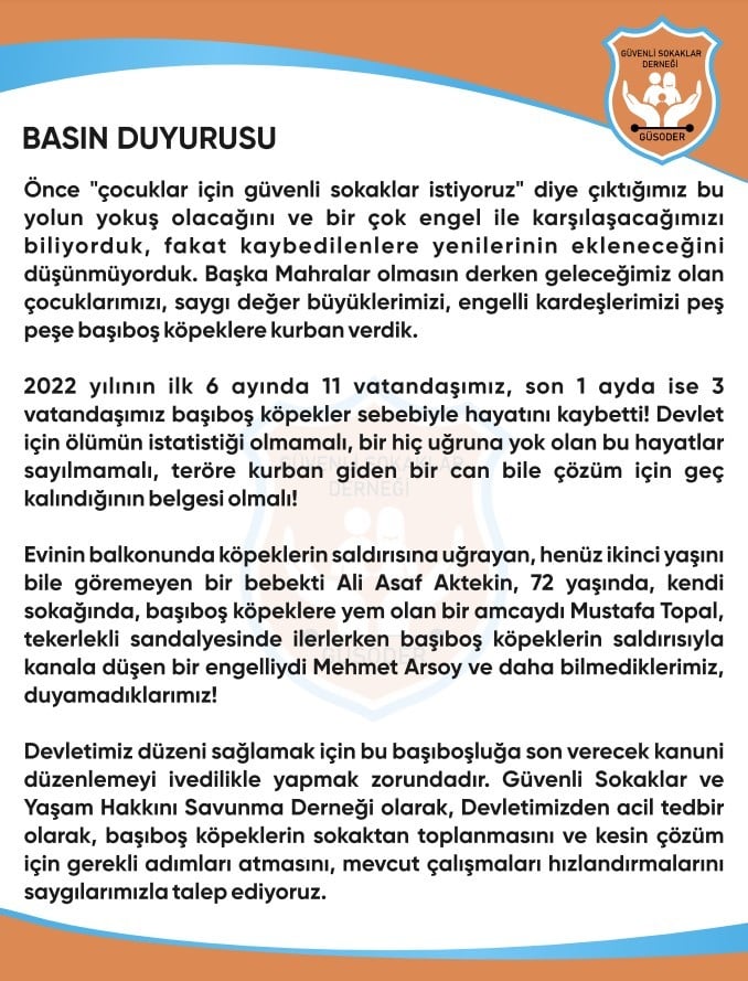 Güvenli Sokaklar Derneği, son günlerde Ağrı'nın Patnos ilçesinde sokak köpeklerinin saldırısına uğrayan Ali Asaf Aktekin'in (2) ve Gaziantep'in Nurdağı ilçesinde, aynı şekilde Mustafa Topal (72) ile Aydın Çine'de Mehmet Arsoy'un kullandığı engelli aracıyla dere yatağına düşerek hayatlarını kaybetmesi üzerine, başıboşluğa karşı tedbir alınması çağrısında bulundu.