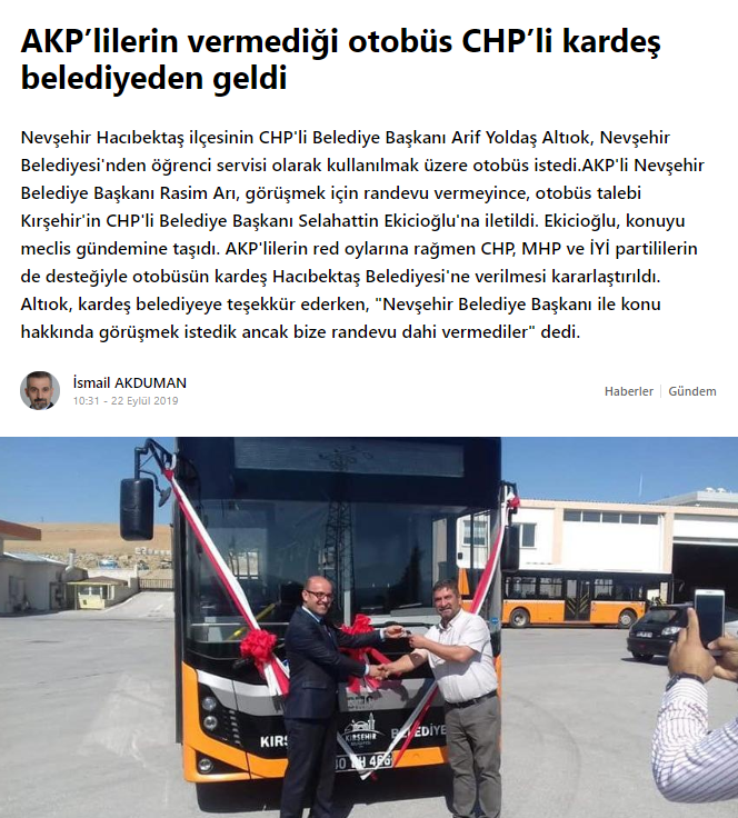 Nevşehir Belediye Başkanı Rasim Arı'dan Sözcü'nün "AKP’lilerin vermediği otobüs CHP’li kardeş belediyeden geldi" başlıklı haberine tepki geldi.