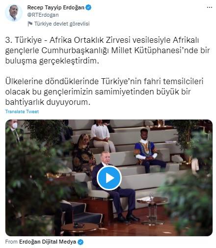 Başkan Erdoğan, "3. Türkiye - Afrika Ortaklık Zirvesi" vesilesiyle Afrikalı gençlerle Cumhurbaşkanlığı Millet Kütüphanesi'nde bir buluşma gerçekleştirdi.
